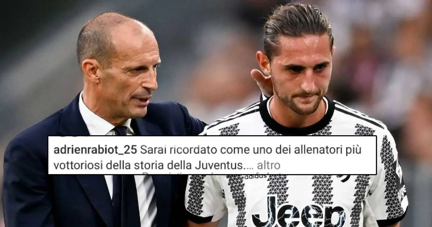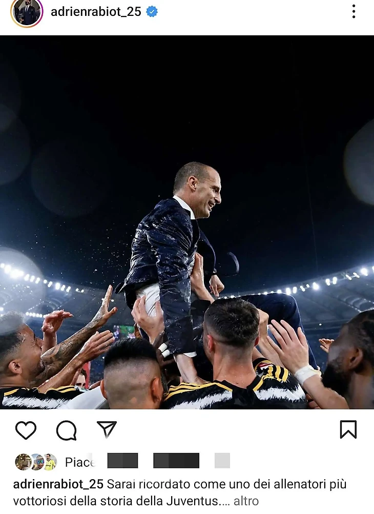 Хавбек «Ювентуса» Адриен Рабьо написал в социальных сетях небольшое, но трогательное прощальное сообщение на уход Массимилиано Аллегри. Сегодня за два тура до конца Серии А с тренером расторгли контракт.