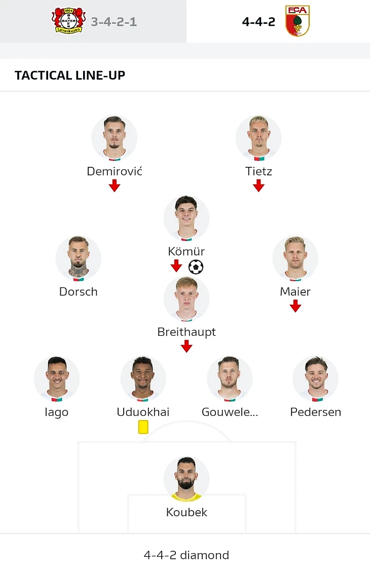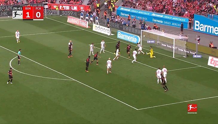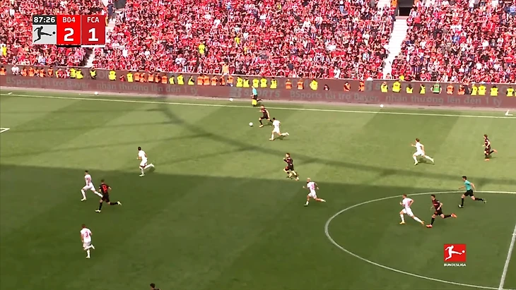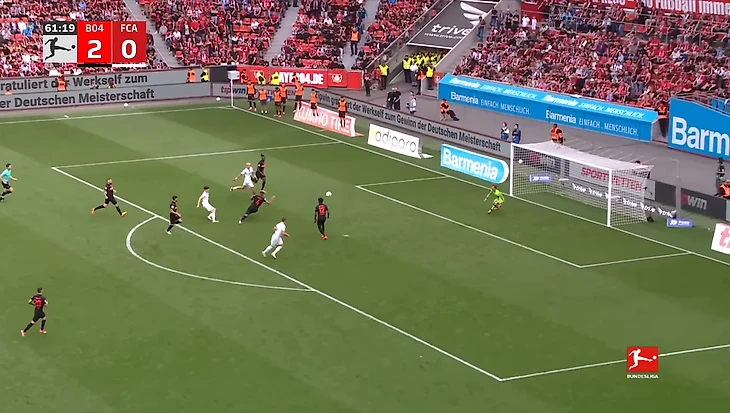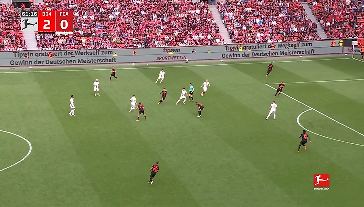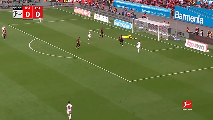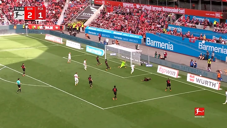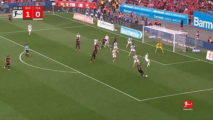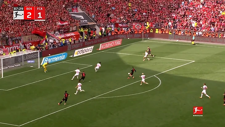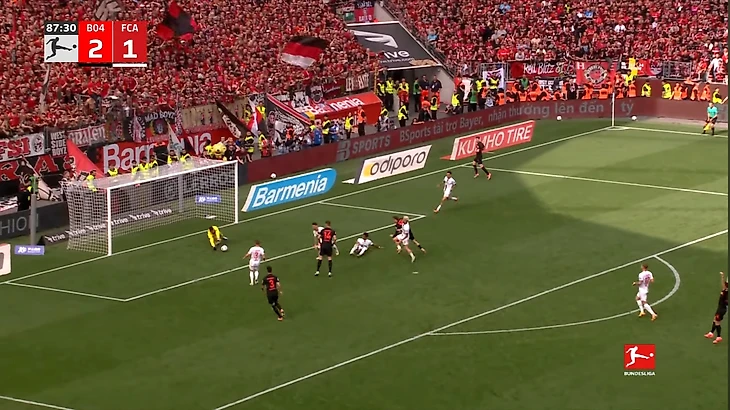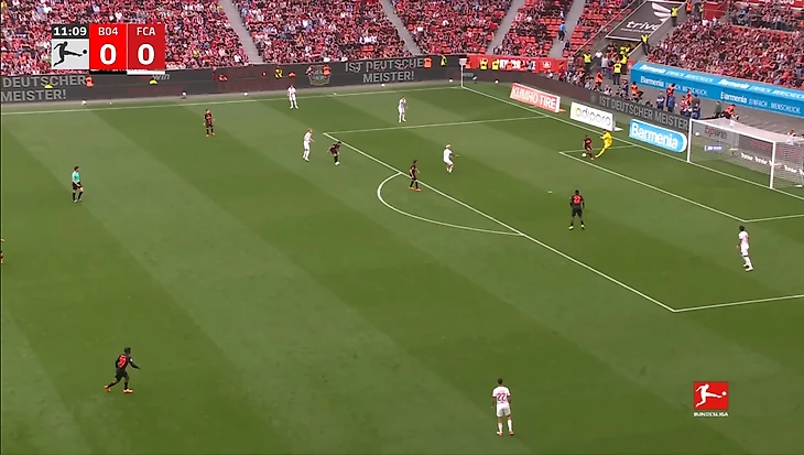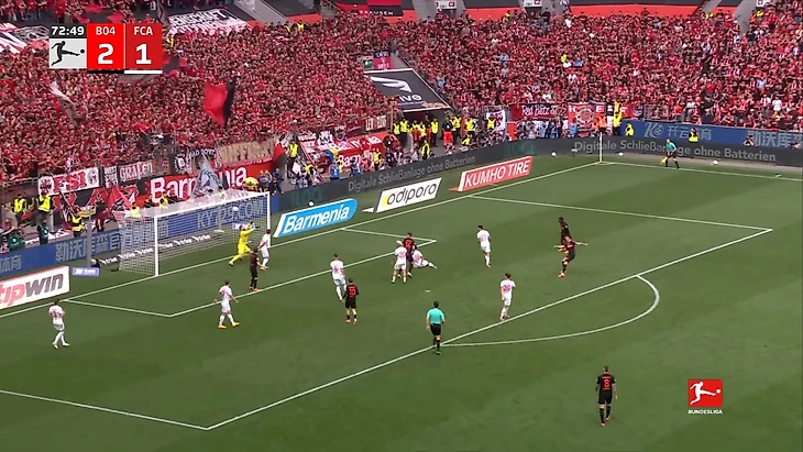 После пропущенного мяча Хаби Алонсо решил внести изменения и выпустил Патрика Шика и Флориана Виртца вместо Адли и Бонифаса. Через несколько минут после выхода на поле Шик оказался в центре внимания Фримпонга, который прострелил в штрафную «Аугсбурга», но Гауэлеу выбил мяч.