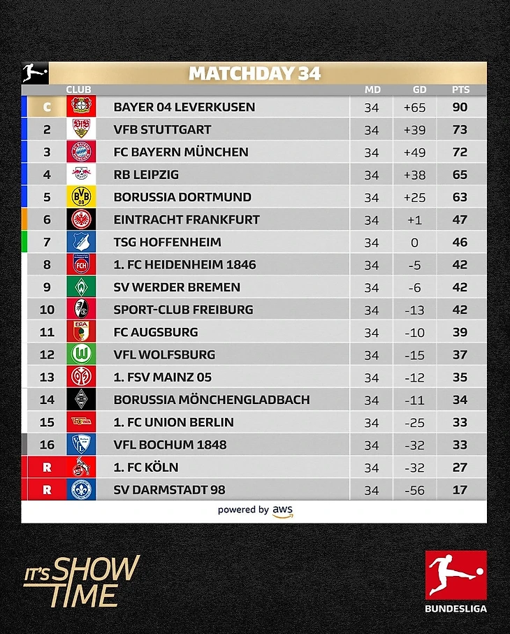 Вот так выглядит итоговая таблица Бундеслиги. «Байер» набрал 90 очков. Совсем чуть-чуть не хватило, чтобы перебить достижение «Баварии» Юппа Хайнекса 2012/13, которая набрала 91 очко за сезон.