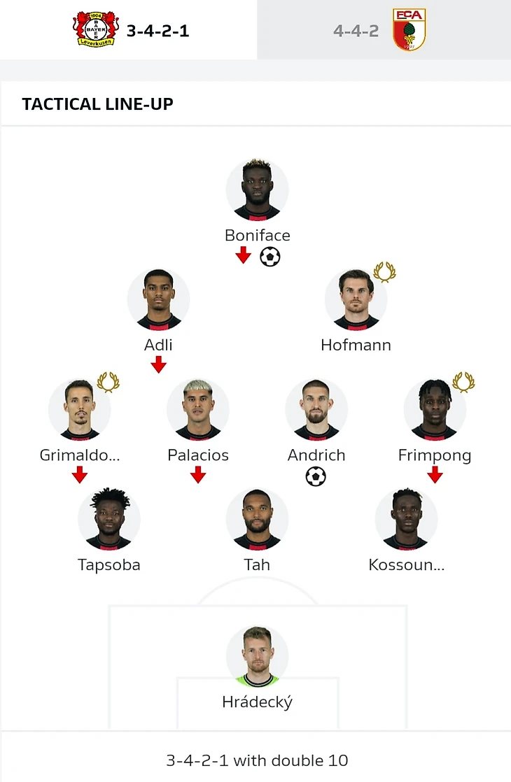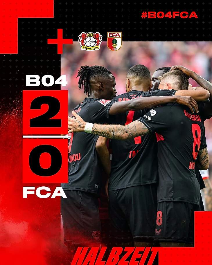 По сравнению с победой со счетом 5:0 над «Бохумом» Хаби Алонсо решил заменить пять позиций в матче против «Аугсбурга». Джереми Фримпонг вышел в старте вместо Йосипа Станишича, а Алехандро Гримальдо вышел на поле вместо Артура. Эксекиэль Паласиос заменил Гранита Джаку в центре поля, а Йонас Хофманн и Амин Адли заменили в атаке Натана Теллу и Патрика Шика. В воротах занял место Лукаш Градецкий. Защита: Эдмонд Тапсоба, Джонатан Та и Одилон Коссуну. На острие атаки находился Виктор Бонифас.