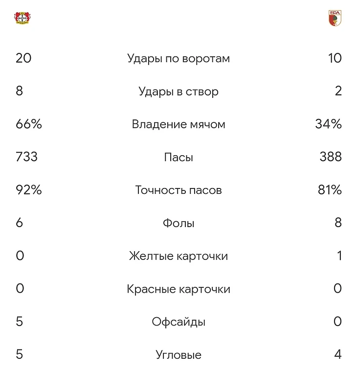 В обороне команда Хаби Алонсо действовала отлично и не допустила каких-либо слишком опасных моментов у своих ворот. 61% выигранных дуэлей против 39% у «Аугсбурга».