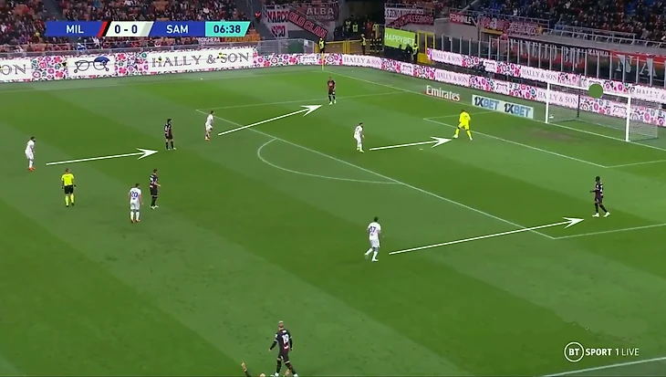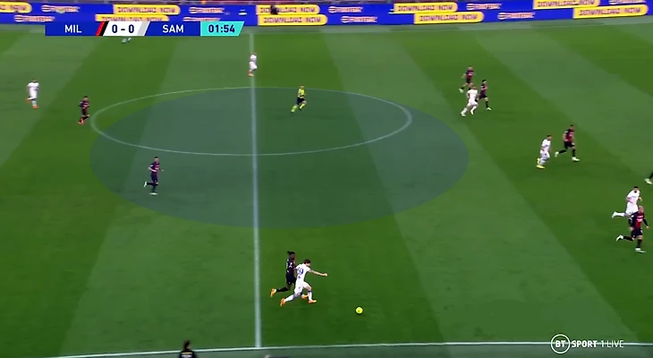 Если «Самп» проходила первую линию прессинга, тут же следовала вертикаль – но уже не заброс наудачу, а подготовленный пас. Опять же, середина опустошалась еще и потому, что Станкович в ней не нуждался: даже выйдя из обороны низом, сразу доставлял мяч вперед. Никакого поступательного перехода по этажам: только выманивание прессинга, чтобы как можно меньше соперников осталось на чужой половине, удлиненная структура и стремительный переход.