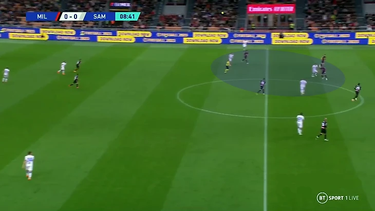 «Сампдория» встречала соперника активным средним прессингом с персональными ориентировками, и если тот хоть немного мешкал, давление становилось тотальным. Ключевую роль играл нападающий. Он не всегда атаковал сам, но перекусывал центральный коридор – то есть определял основного пасующего (вратарь или центральный защитник) и лишал самого перспективного варианта.