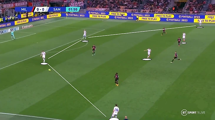 Завладев мячом, «Сампдория» строила атаку снизу – в завязке владения участвовали защитники и один из опорников. Другой полузащитник опускался под пас, только если выход застопорился. Крайки открывались предельно широко, чтобы растянуть прессинг по горизонтали, и обычно за первой линией давления.
