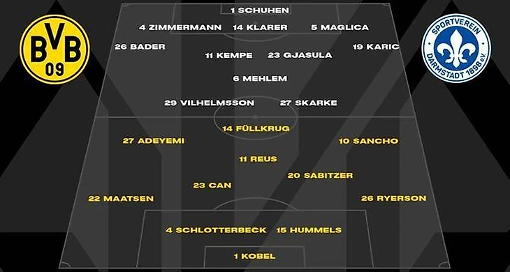 Но, поскольку эта игра не являлась последней в сезоне, то перед финалом Лиги Чемпионов главный тренер «Боруссии» Эдин Терзич не стал вносить никаких изменений: Грегор Кобель, Иан Маатсен, Нико Шлоттербек, Матс Хуммельс, Юлиан Рюэрсон, Эмре Джан, Марсель Забитцер, Карим Адейеми, Джейдон Санчо, Марко Ройс и Никлас Фюллькруг. Даже трансформация расстановки 4-2-3-1 в 3-4-3, и обратно, не изменилась.