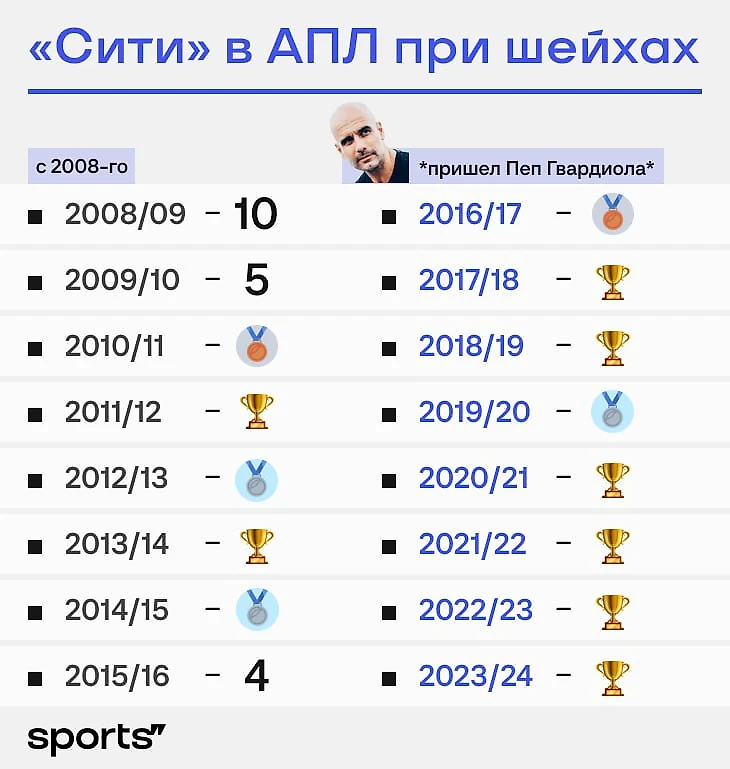 8 чемпионств за 16 лет – это «Сити» при шейхах. Пара до Пепа, шесть с ним