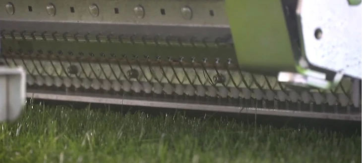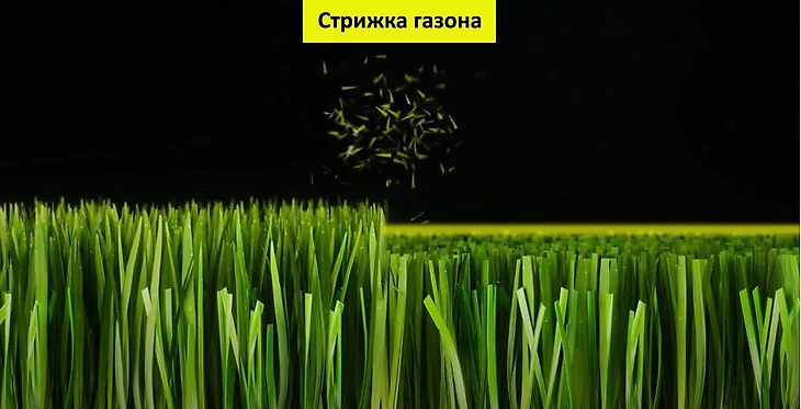 Таким образом, получается гибрид натуральной травы и синтетического укрепления, который заключительно выравнивается скашиванием под нужную высоту газона футбольного поля: