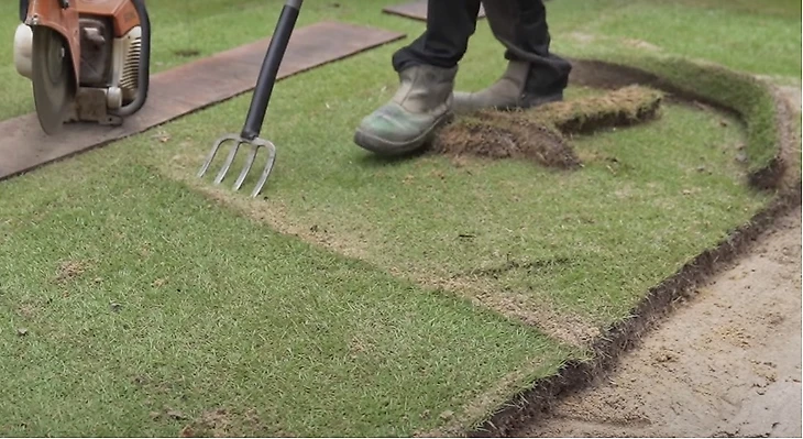Ручная калибровка вилами пластов газона (ну, а куда без этого):