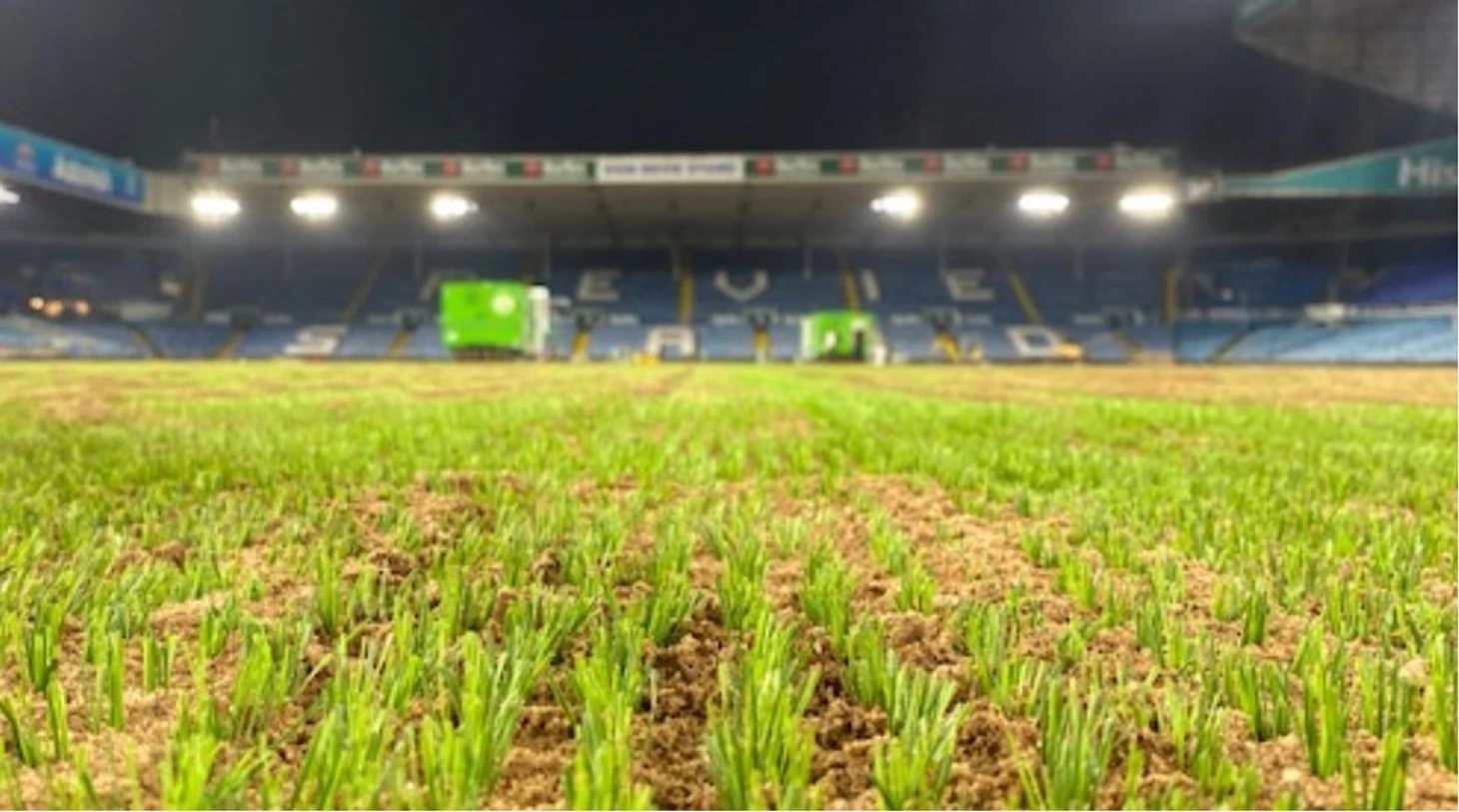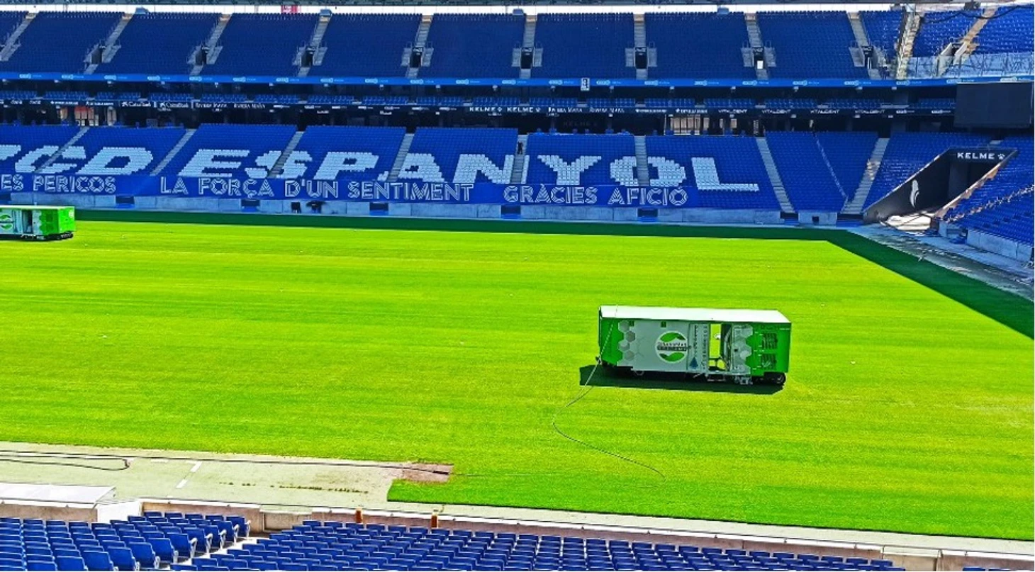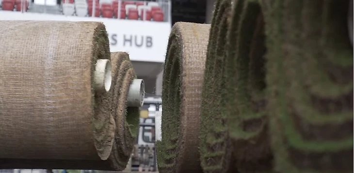 Выращенный готовый гибридный газон поставляется в рулонах на футбольный стадион: