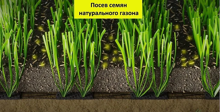 Данный технология состоит из натурального газона с неразлагаемой или разлагаемой почвенной основой, в которую заранее внедрён массив синтетических волокон.