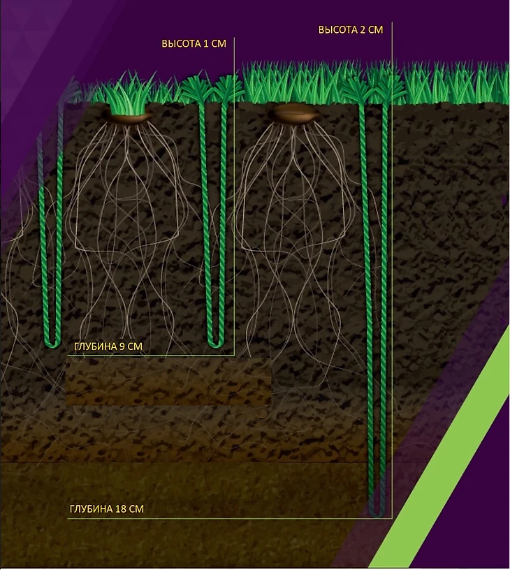Синтетические волокна выступают на 1-2 см над поверхностью корневой зоны в количестве 20 миллионов для обеспечения зелёного цвета поверхности и усиления естественного газонного покрова:
