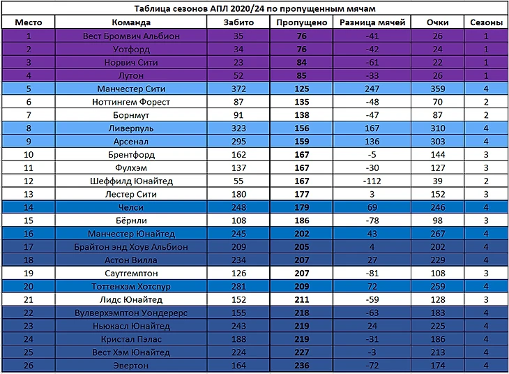 Таблица сезонов АПЛ 2020/24 по пропущенным мячам