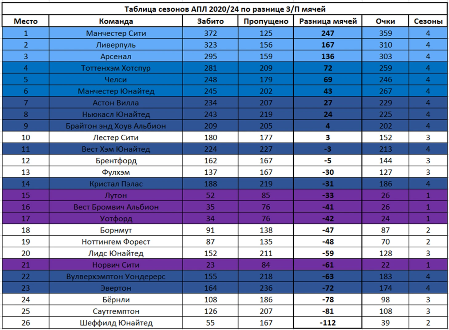 Таблица сезонов АПЛ 2020/24 по разнице З/П мячей