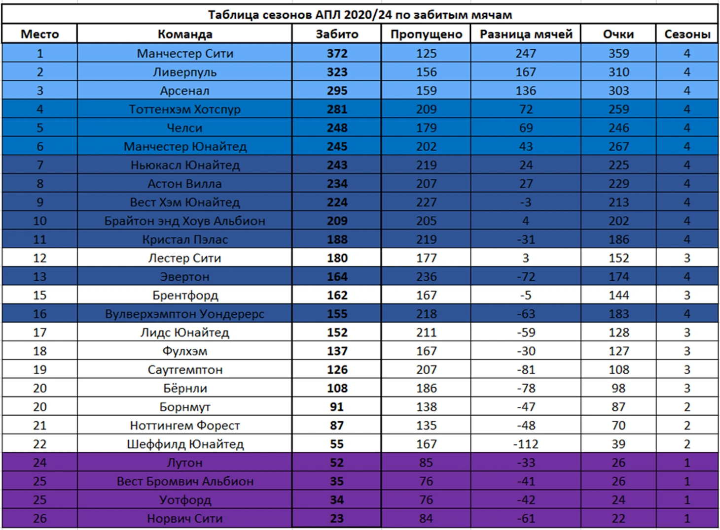 Таблица сезонов АПЛ 2020/24 по забитым мячам