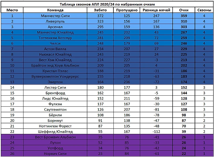 Таблица сезонов АПЛ 2020/24 по набранным очкам