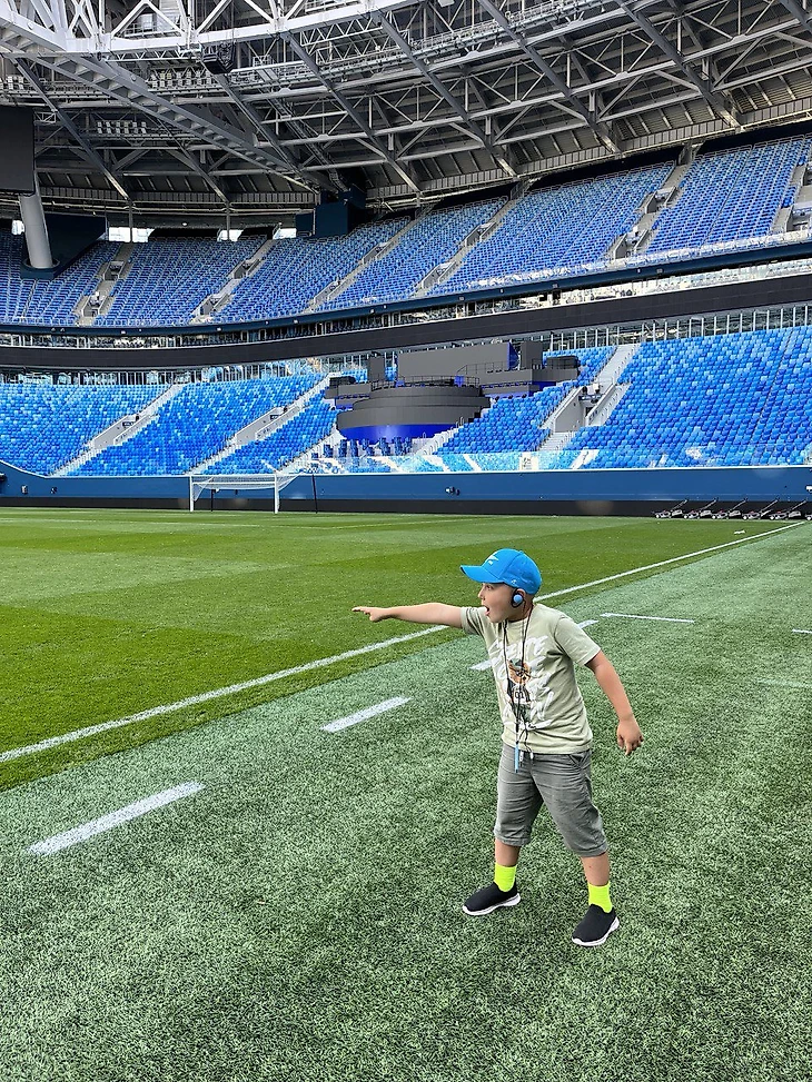 Во время экскурсии по стадиону «Зенита» он просит сфотографировать его у поля так, словно он тренер.
