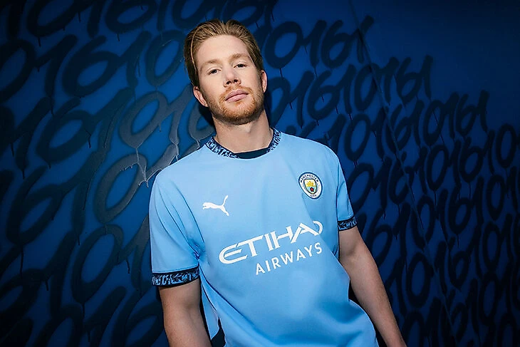 Классический небесно-голубой цвет сочетается здесь с темно-синим узором на воротнике и рукавах. С внутренней стороны воротника нанесены цифры 0161 – телефонный код Манчестера.