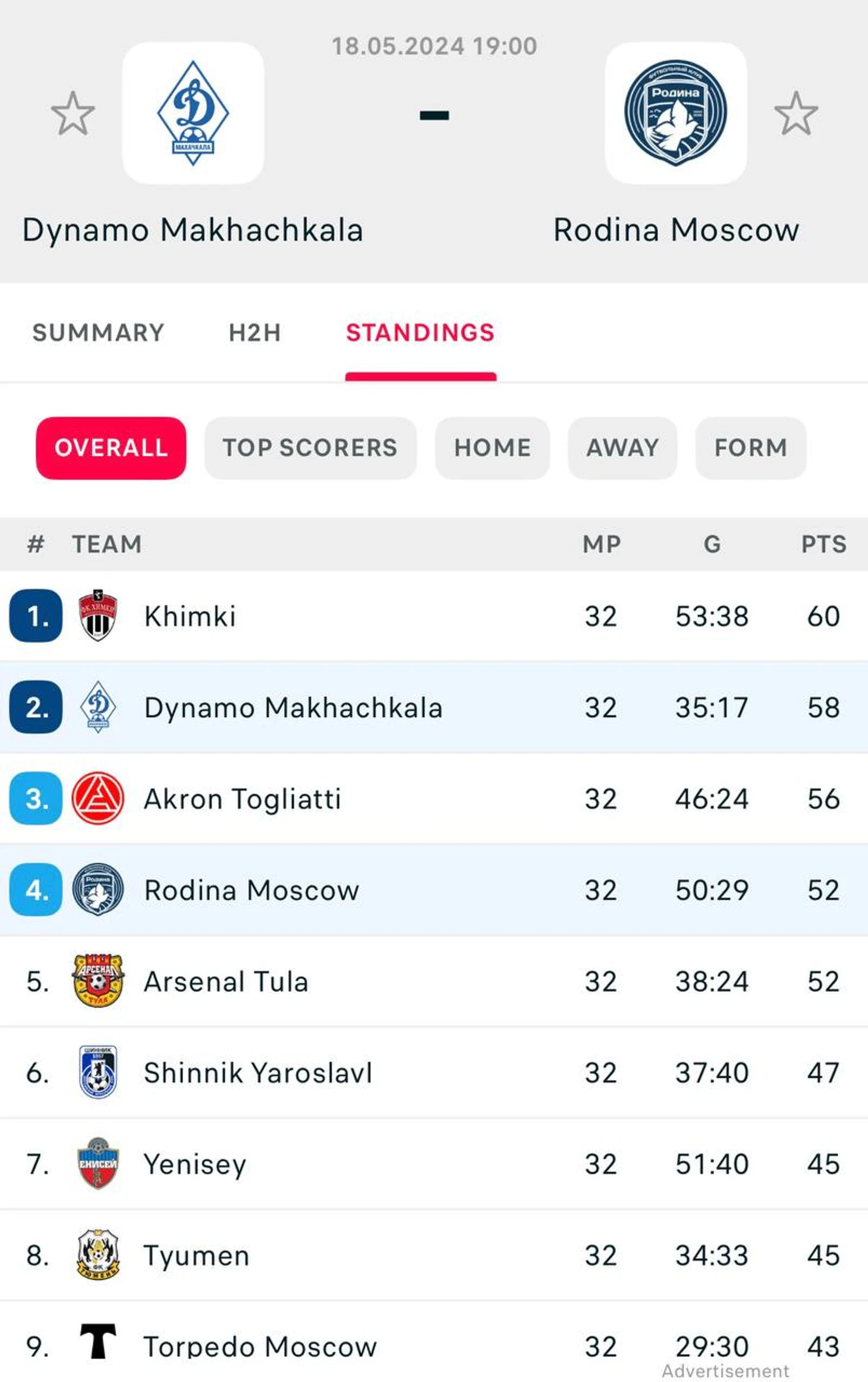 Вчера, 20.05 «Акрон», занимающий третье место в ФНЛ, проиграл в Туле 1-0 и тем самым «Динамо» Махачкала впервые на 97 лет выходит в РПЛ. В субботу 25.05 заключительный тур в котором «Динамо» отправляется в Грозный на матч с «Аланией», а «Химки», идущие на 1-ом месте, дома принимают «Черноморец». В этих двух матчах будет разыграно 1-ом место ФНЛ 23/24.