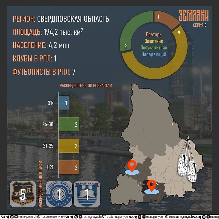 Свердловская область представлена в РПЛ 7-ю игроками, 5 из которых играют на родине в Урале. Распределение по возрастам практически сбалансировано, а вот по амплуа наоборот.