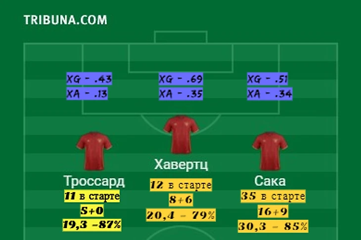 Сака - безоговорочный игрок основы. Хавертц в конце сезона на позиции нападающего в 12 играх набил 8+6. На левый фланг - три игрока. Последние матчи играл Троссард.