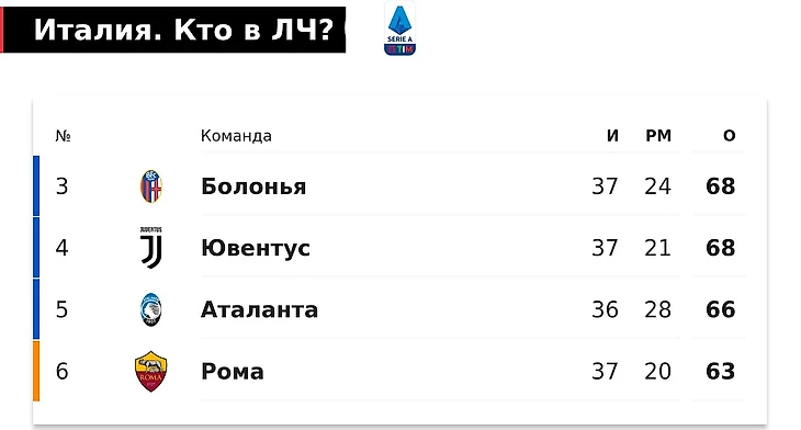 Зафиналим: если «Аталанта» войдет в топ-4, бонусный слот победителя ЛЧ ей не понадобится, из Серии А в Лигу чемпионов попадут пять первых команд (то есть с дополнительного пятого места пробьется тот, кого «Аталанта» из первой четверки вытолкнет, «Болонья» или «Ювентус»), а «Рома» выйдет в Лигу Европы.