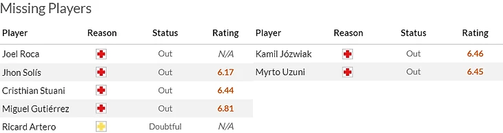 Из тех кто может этому поспособствовать выделяется вернувшийся в общую группу Мигель Гутьеррес(5,5). А вот у гостей уже никаких задач на сезон не осталось, так что место в рамке скорее всего снова займет Мартинес(5). Кроме того не поедет в Каталонию приболевший Игнаси Микель(5) и Рауль Фернандес(5), а также может не выйти на поле не совсем здоровый Онгла(5.5).