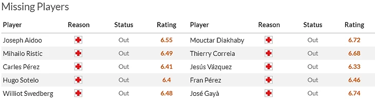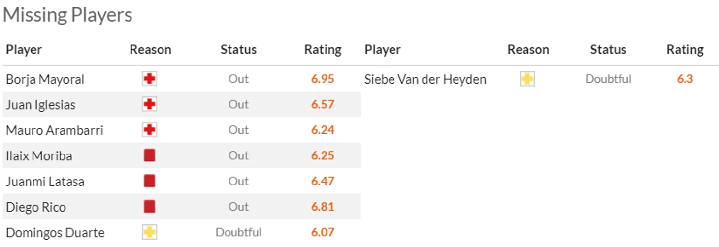 Что касается гостей, то они без всяких рекордов вылетели в прошлом туре, не одолев дома Лас-Пальмас. И вероятнее всего не смогут рассчитывать в последнем туре на приболевших Усу(5) и Макси Гомеса(7).