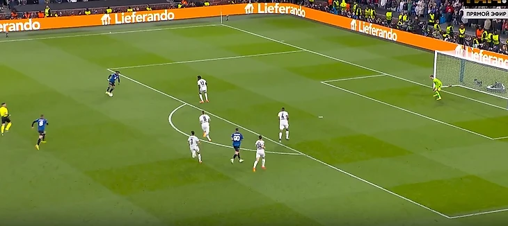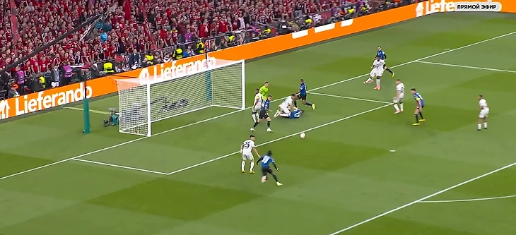 Второй гол: Адли делает скидку на Вирца, но немцу не удается поймать мяч, хотя он вроде как успевал. Мяч практически от центрального круга докатывается в район 14-й зоны к Лукману, тот накручивает Джаку и кладет аккуратной в дальний нижний угол.