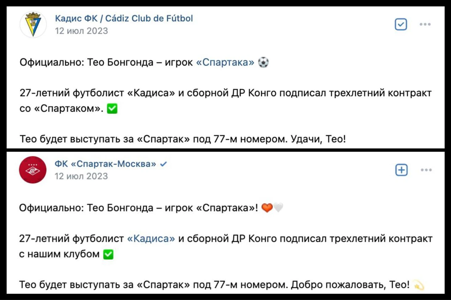 После подтверждения перехода Тео Бонгонда из «Кадиса» в «Спартак», оба клуба отметили друг друга в постах о переходе игрока во «ВКонтакте».