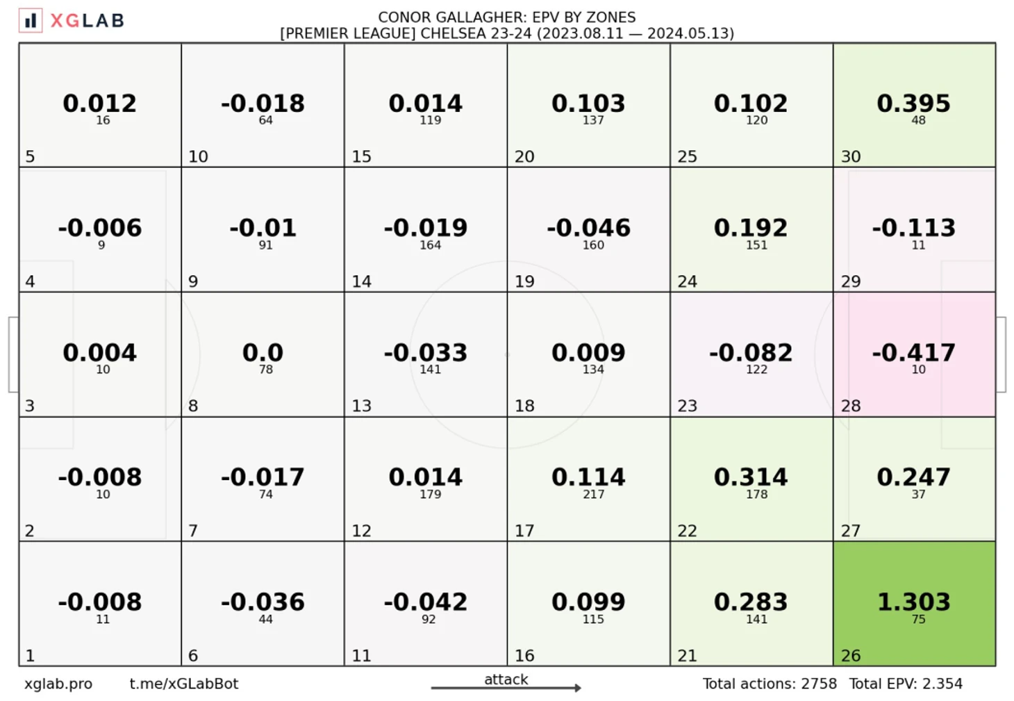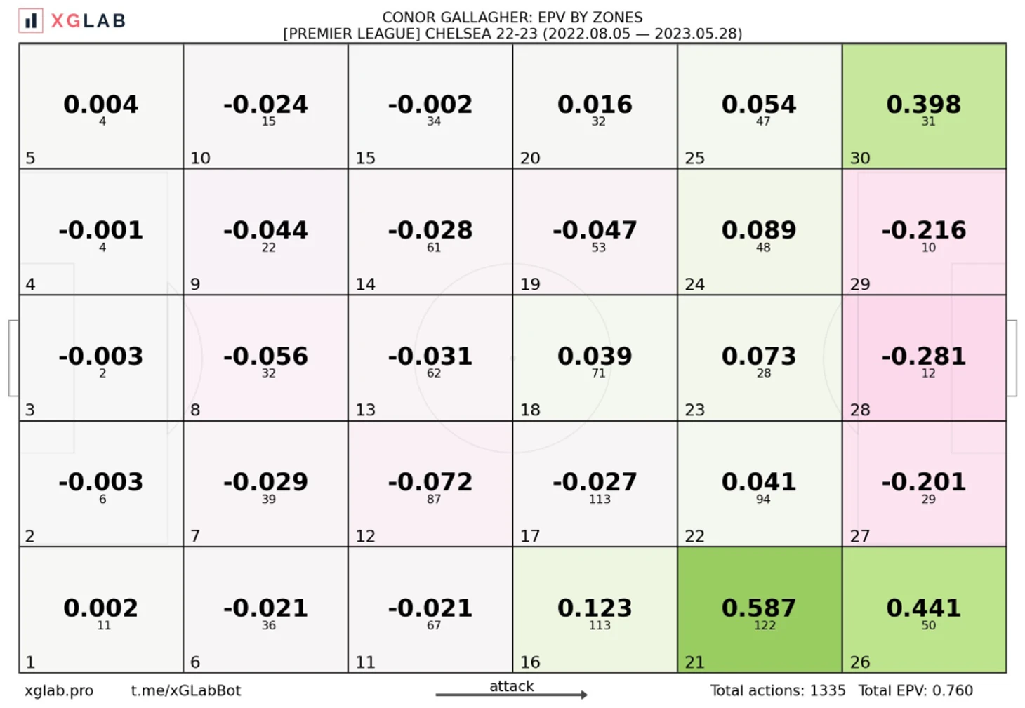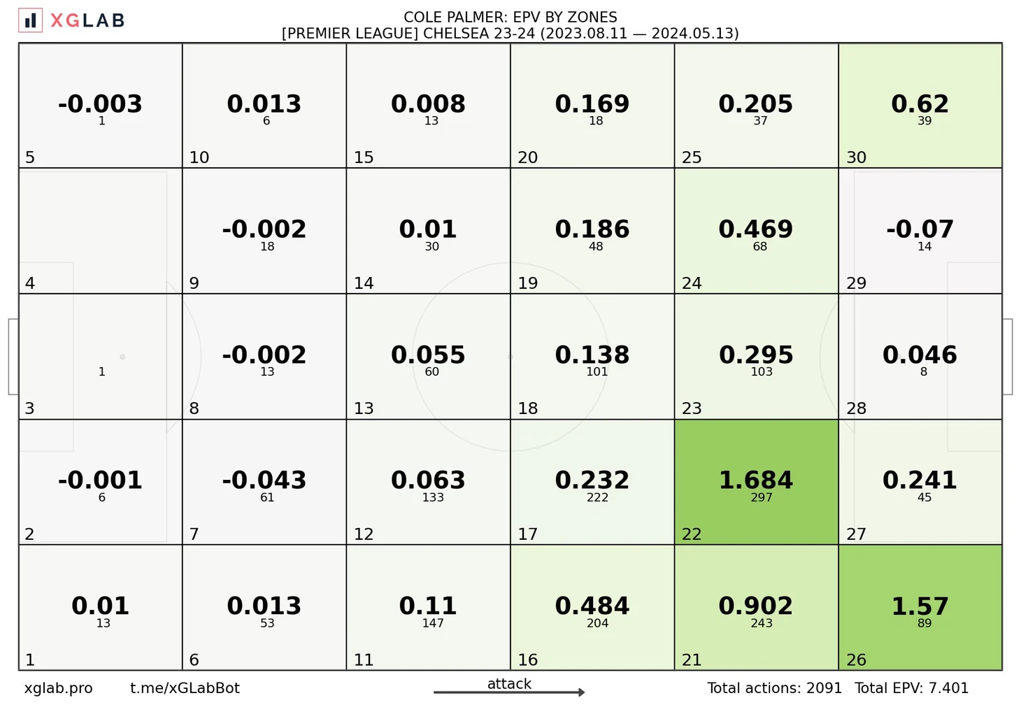 А график EPV позволяет вычленить закономерность – именно в 22-й зоне Коул создает больше опасности для соперника. Да и эффективность Палмера зашкаливает – всего в 6 зонах из 26 Коул имеет отрицательное значение EPV.