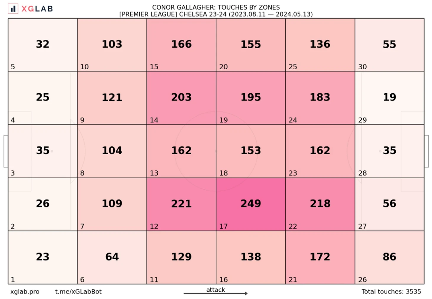 Заметно увеличилась вовлеченность Конора в финальной трети, плюс карта касаний только подтверждает его прогресс в игре слева. Перевод в центр дал больше творческой свободы для Галлахера – футболист также продолжил больше созидать в 17-й зоне. Возросла и вовлеченность к обороне – Конор довольно часто опускался ниже, помогая защитникам для начала атак.