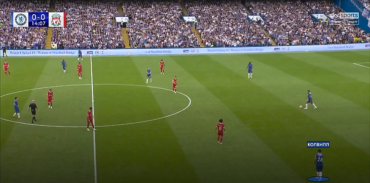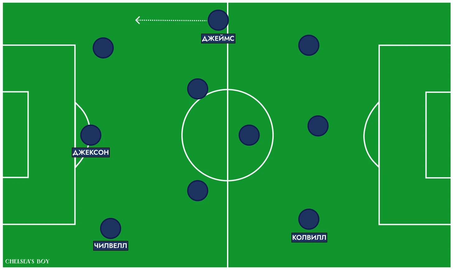 А место левого фулбека занял номинальный центральный защитник Левай Колвилл. Как мы видим, с подключениями Джеймса сохранилась четверка в атаке, но уже с идеей перегруза флангов и полуфлангов.