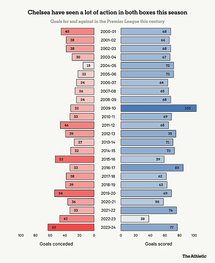 Маурисио Почеттино научил «Челси» забивать. В прошлом сезоне команда Томаса Тухеля, Грэма Поттера и Фрэнка Лэмпарда «наколотила» солидные 38 мячей. В этом же сезоне «Челси» закончил АПЛ с 77 голами в 38 играх. Такой результат является третьим лучшим показателем клуба за всю историю АПЛ, уступая только сезонам 2009-10 (103 гола) и 2016-2017 (85 голов).