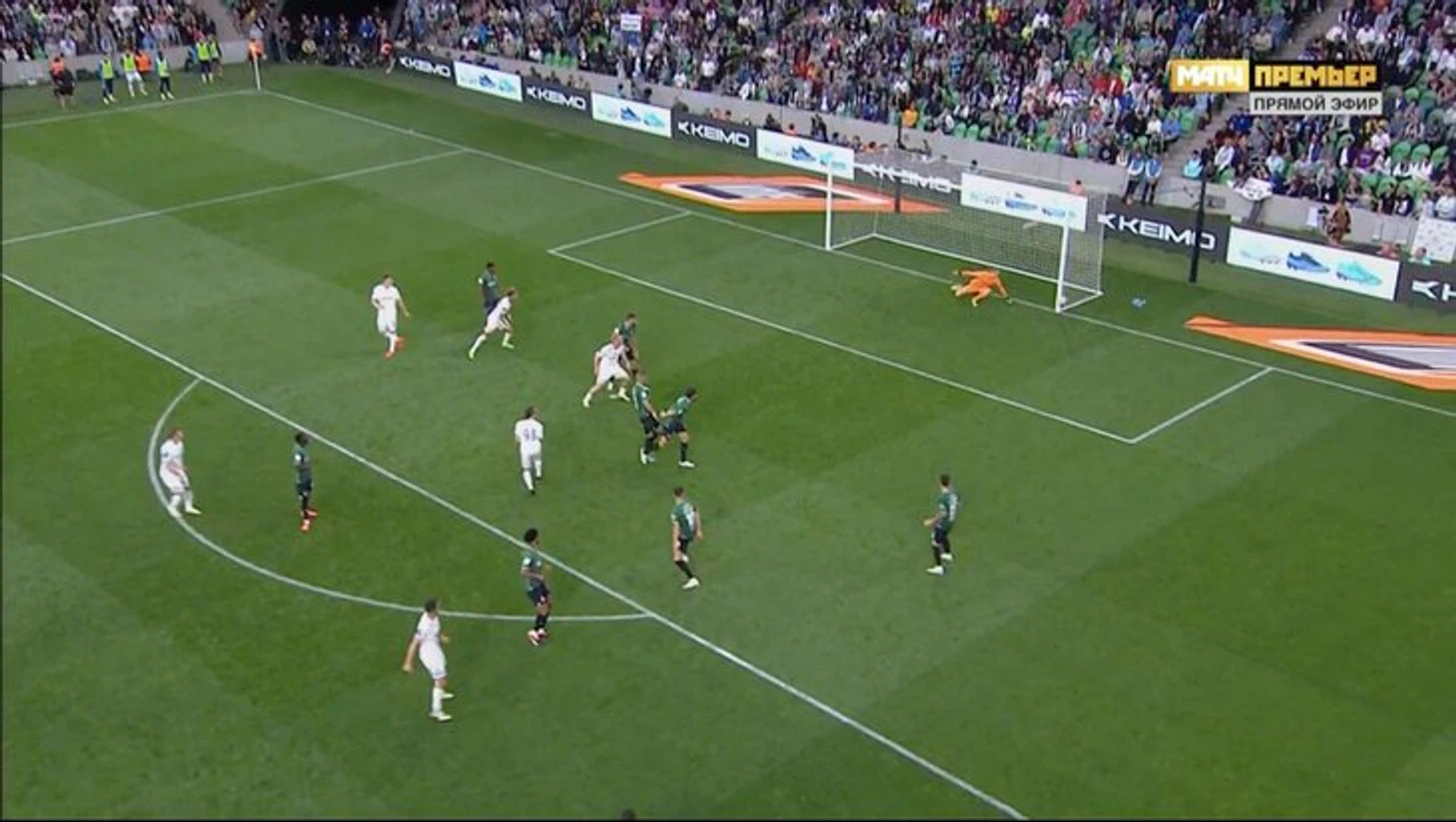 На подачу среагировал Фабиан Бальбуэна – защитник попробовал продлить голевую серию после дубля в игре с «Крыльями». Здесь получилось слабее, но спровоцировало серию отскоков – в результате мяч пришел к другому ЦЗ Роберто Фернандесу – и он с близкого расстояния тоже зарядил в штангу.