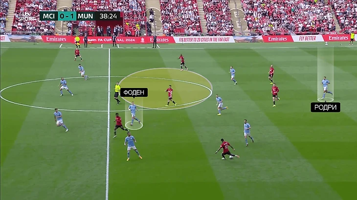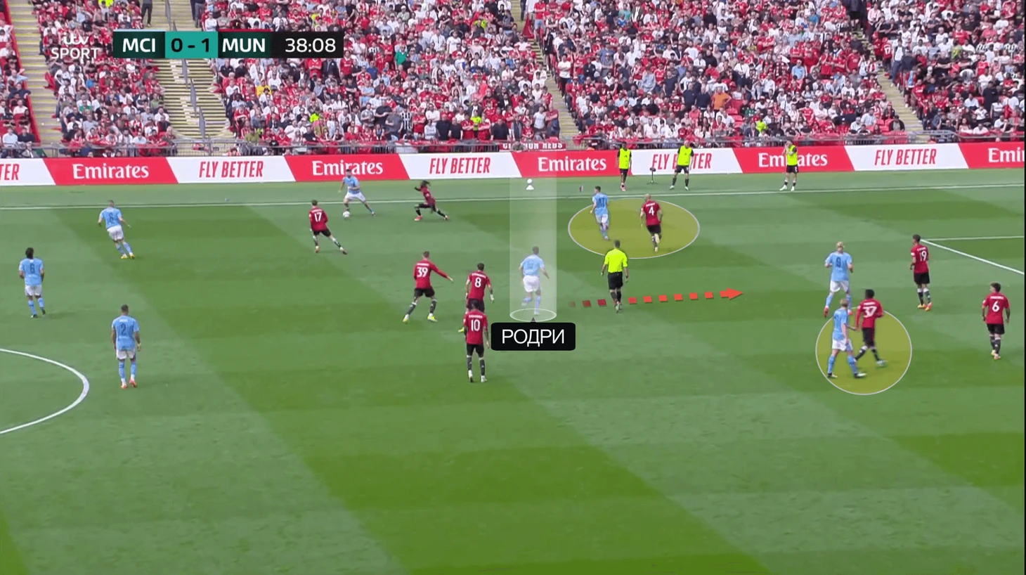 Второй мяч – прямой итог подключения Родри. Сначала испанец распознал дыру в обороне «МЮ»: