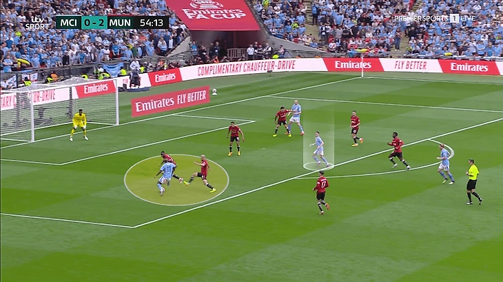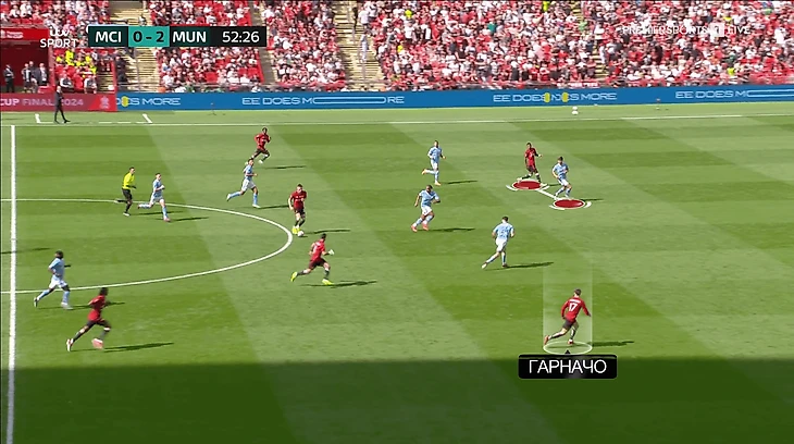 Во втором тайме был похожий эпизод, но уже после короткого розыгрыша в исполнении «МЮ». Рэшфорд снова уводит Стоунза за собой и ломает защиту «Сити». Этим снова пользуется Гарначо, до которого дойдет мяч: