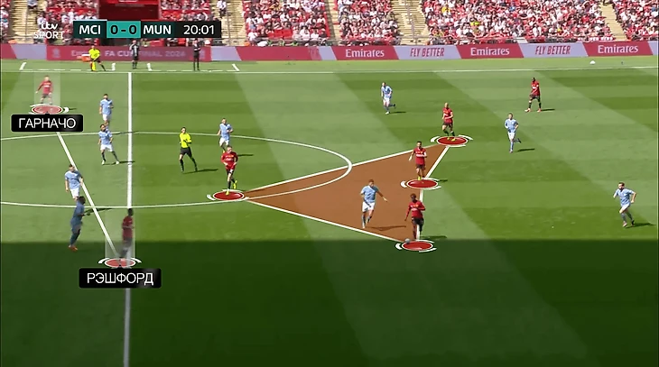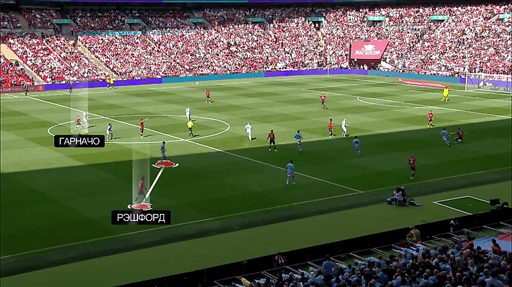 По ходу эпизода рывки за спину делали и Рэшфорд, и Гарначо. Спринт аргентинца стал решающим, но глубину атаке дал именно Маркус. Благодаря его ускорению удалось поломать офсайдную ловушку «Сити» и утянуть за собой Джона Стоунза. Англичанин не успел вернуться на одну линию с партнерами: