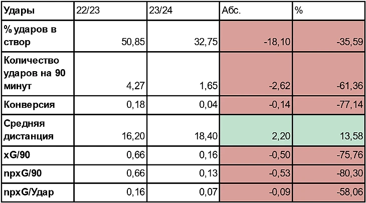 Для сравнения посмотрим на те же показатели, но в сезоне 23/24. Чтобы было соизмеримо, уберём 2 гола с пенальти: