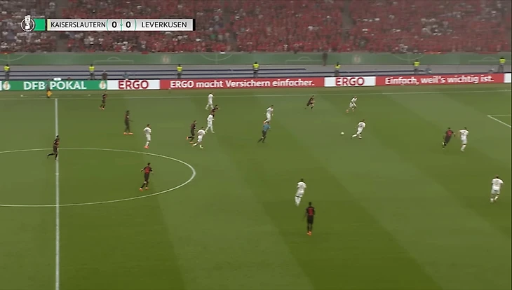«Кайзерслаутерн» ярко стартовал против «Байера», надеясь завершить этот сезон трофеем. Команда Фридхельма Функеля старалась прессинговать, но застревала в переходах, пытаясь быстро переключать режимы обороны и атаки. «Кайзерслаутерну» это давалось довольно сложно, так как команда почти не владела мячом. Всё владение забрал «Байер». В первом тайме владение составило 74% на 26% в пользу «Байера».