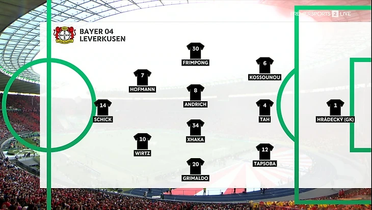 Хаби Алонсо изменил стартовый состав на шести позициях по сравнению с финалом Лиги Европы против «Аталанты» из Бергамо. Лукаш Градецкий заменил Матея Ковараж в воротах (то о чём я писала в тексте про финал Лиги Европы), а Одилон Коссуну, Роберт Андрих, Йонас Хофманн и Патрик Шик на этот раз вышли в старте вместо Пьеро Инкапье, Йосипа Станишича, Эксекиэля Паласиоса и Амина Адли.