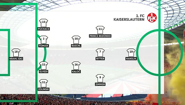 70-летний Фридхель Функель, который после финала Кубка Германии покинул пост главного тренера, выставил «Кайзерслаутерн» по схеме 4-2-3-1, которая трансформировалась в 4-1-4-1. В воротах занял место Краль. Защита: Залински, Эльведи (Это брат Нико Эльведи, который играет за «Боруссию Мёнхенгладбах»), Томяк и Пухач. Полузащита: Рашль и Калоч. Нападение: Циммер, Риттер, Редондо и на острие атаки находился Ханслик.
