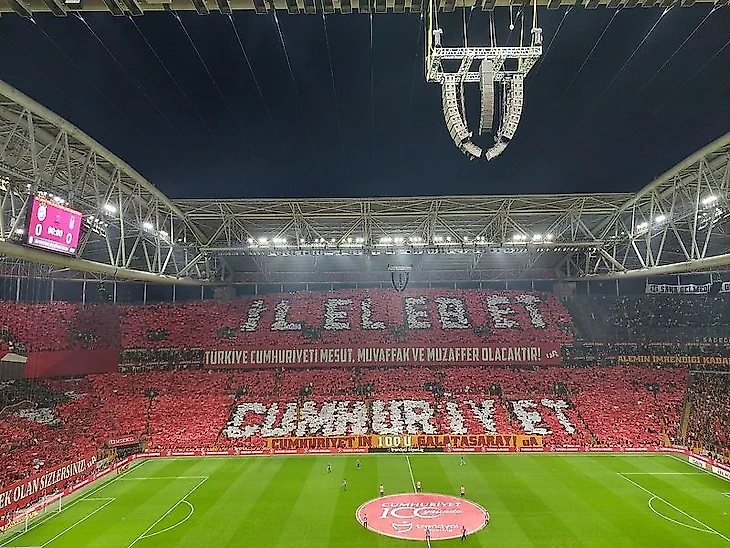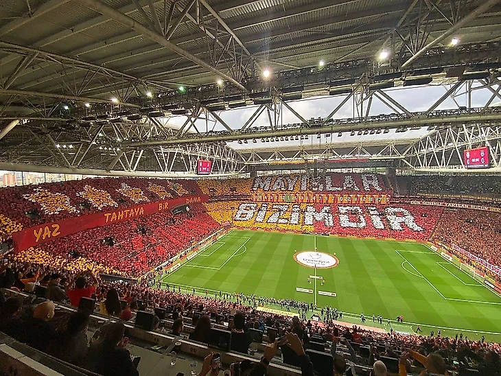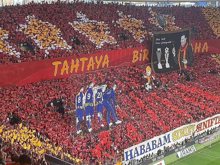 На центральной и противоположной трибунах все и вся, естественно, в желто-красном цвете, пять звезд (если бы «Галатасарай» оформил чемпионство в той игре, это стал бы его 24-ый титул; еще один и эмблема пополнится пятой звездой), надпись «Каждый май – наш» (в том смысле, что именно в этом месяце «Галатасарай» регулярно становится чемпионом), а также слова «Еще раз напишите это на доске» с отсылкой к уже упомянутому баннеру с Оканом.