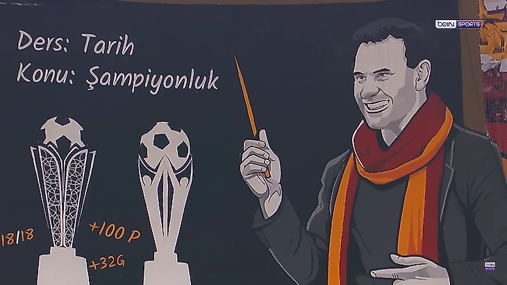 В части с главным тренером Оканом Буруком фанаты «Джимбома» (почему «Галатасарай» в Турции называют именно так, читайте в этой статье) подошли наиболее креативно. Турецкий специалист на соответствующем баннере изображен в роли учителя у школьной доски с указкой в руках. На доске надпись: «Урок истории. Тема – чемпионство».