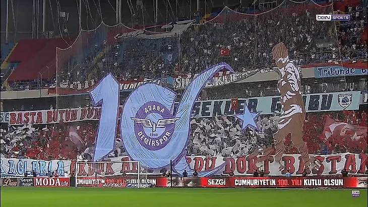 «Галатасарай» местные фанаты принимали в трибунах, полностью окрашенных в голубой и белый цвета, с главным баннером, изображающим простого работягу из Аданы и несущийся поезд TCDD (турецкий РЖД), поскольку одна из первых железных дорог за пределами западной части Турции располагалась по маршруту «Мерсин – Адана», а также надписью «Her sokakta izin, bu memleket bizim» («Нам открыты все улицы, это наша страна»).