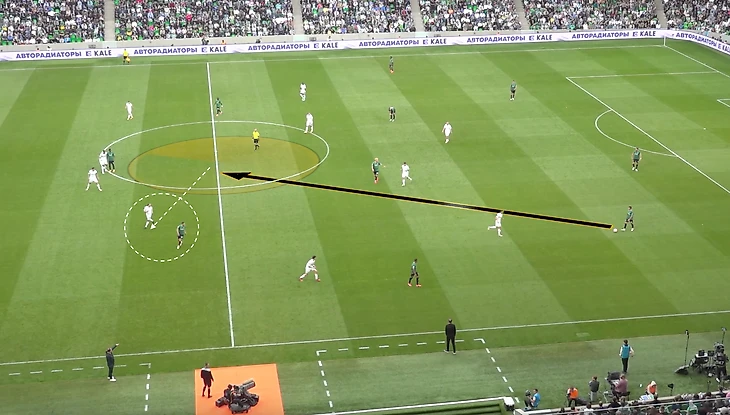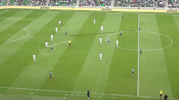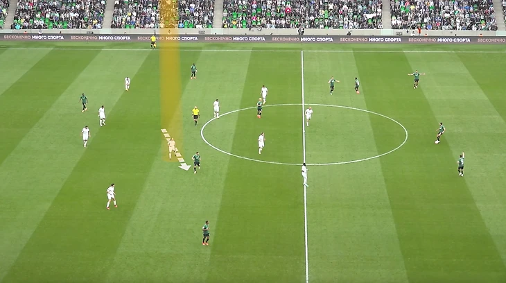 Именно после этого момента Краснодар забьет гол. Лаксальт покидает центр, смещается на фланг потому что там уже наша 10ка. В итоге зону заполнил Никита Кривцов, и это стало если не прямой зависимостью с голом, то как минимум такой маневр помог доставить мяч в зону завершения, что и является целью позиционной атаки.