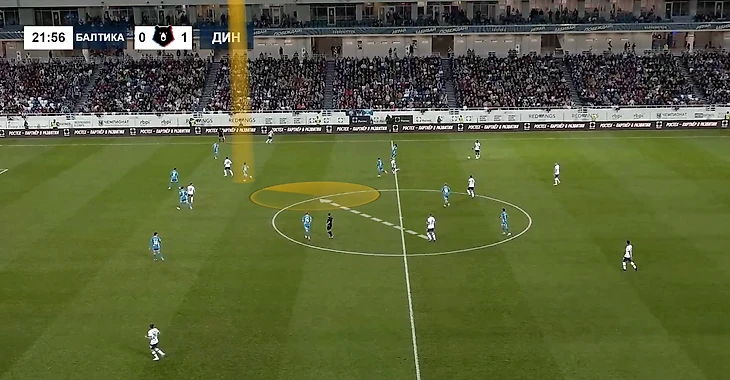 Игрок Балтики уводит опорного из центре поля, в следствии чего появляется хорошее пространство для игры в недодачу от нападающего или для заполнения этого пространство кем то из опорной зоны.