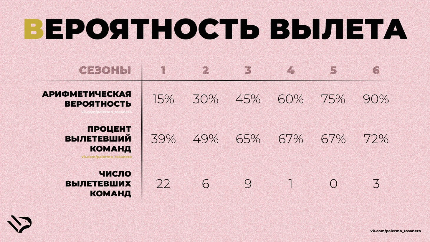 Начнем с вероятности вылететь. Соглашусь, что обычная бытовая математика не учитывает многих факторов и приравнивает в вероятности победить и вылететь аутсайдера турнира с действующим чемпионом. Тем не менее, арифметическая вероятность вылететь в Серию Б у любой команды на старте сезона равна 3/20, фактически, 15%. Эта вероятность растет с каждым сезоном, и к третьему сезону составляет (3/20)*3 – 45%, и на седьмой сезон достигает значения больше 100%.