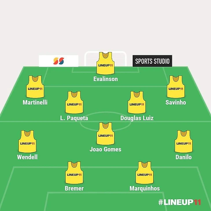 1. Данило, Маркиньос, Бремер и Венделл; Жоао Гомес, Дуглас Луиз и Лукас Пакета; Савиньо, Эванилсон и Габриэл Мартинелли;