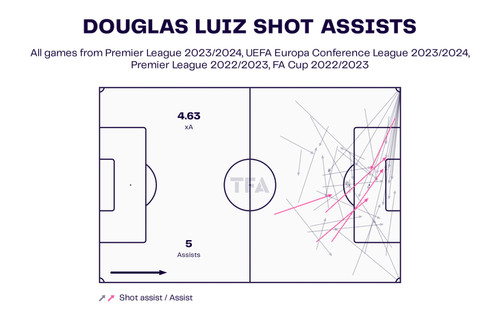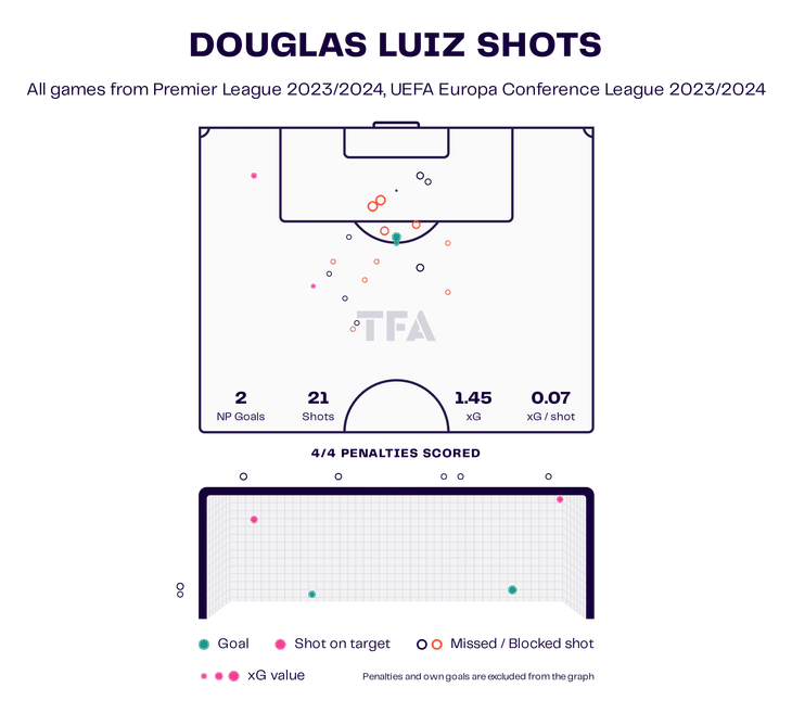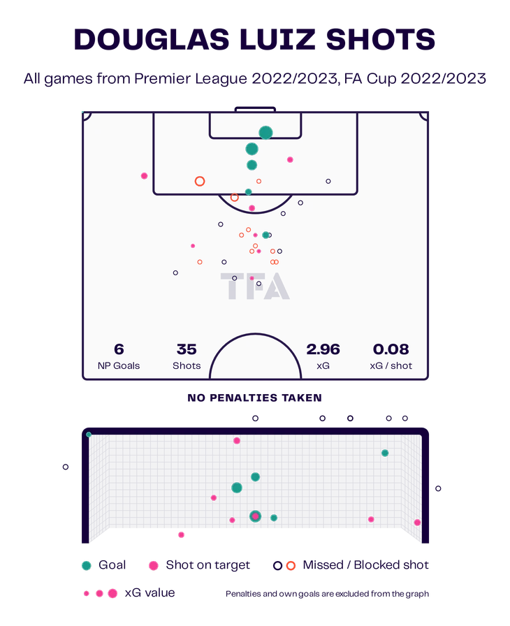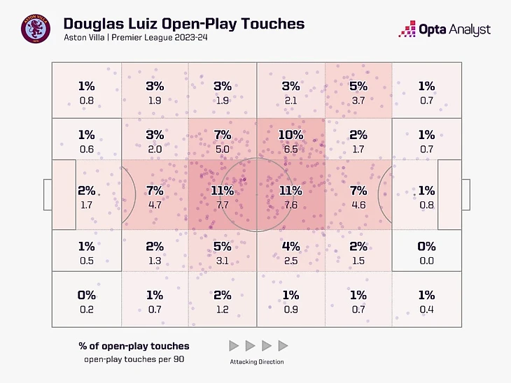 Думаю в основание центрального треугольника лучше поместить Дугласа Луиза. Дугги перестал страдать ерундой и наконец-то вышел на мировой уровень. Как следствие интерес «Арсенала», Сити и «Ювентуса». Выносливость, пожалуй, одна из наиболее упускаемых из виду черт футболиста, а физическая выносливость Луиза — лишь одна из многих вещей, которые делают его таким ценным активом. С момента своего прибытия в 2019 году Луиз провел за «Виллу» больше матчей, чем любой другой игрок, и, по данным Transfermarkt, не пропустил ни одной игры из-за травмы.