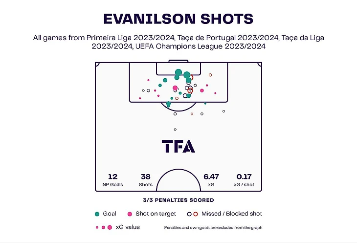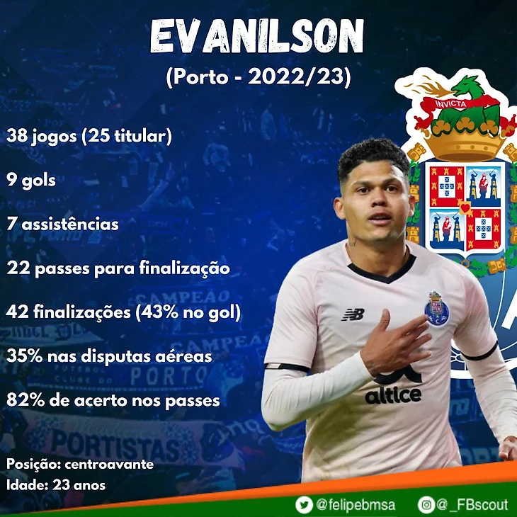 Единственное что смущает, и это подтверждают его детские тренеры, стабильность не конек Эванилсона. Попав в «Порту» осенью пандемийного 2020 года он логично потратил первый сезон на адаптацию (да и не до футбола тогда всем было) и уже в сезоне 2021/22 привлек к себе внимание Большой Европы, забив за «драконов» 21 гол в 46 матчах сезона. Говорили даже о детальном интересе «красных дьяволов» из АПЛ. Не сложилось. И прошлый сезон - 2022/23 вышел как минимум средним по всем показателям.